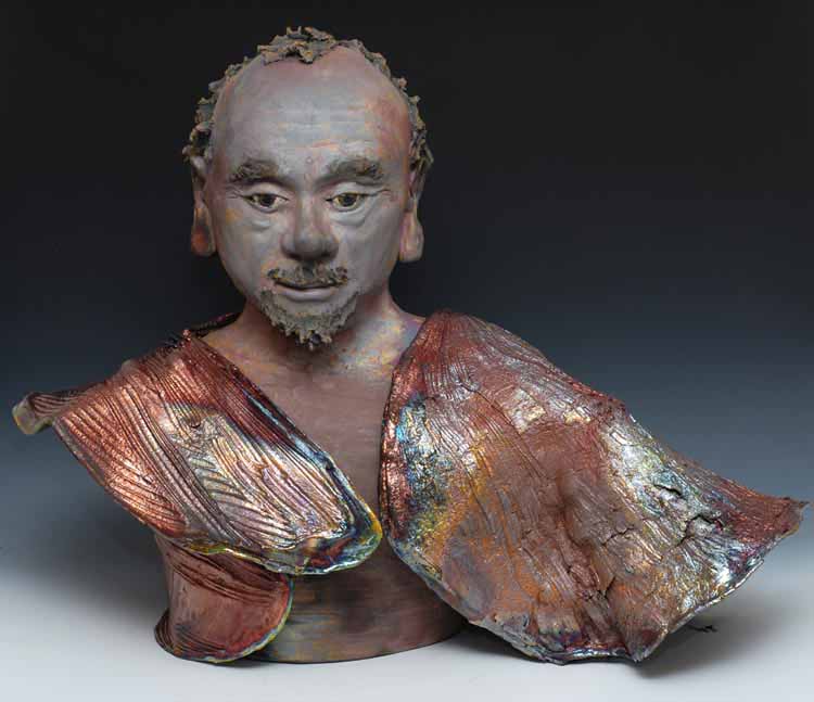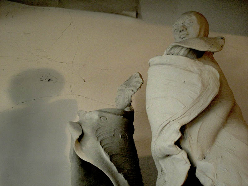 In the physical act of working the clay I reflect these two essential components (moment world, infinite time and space) in this way: the fleeting, sometimes ragged and torn movement suggested in the body/robes…. paired with the enduring, infinite stillness within the calm face. These faces may be sad, happy, or in between — but all mean to suggest a still equanimity. There is something wonderful and necessary about having an idealized image that inspires us to think that equanimity is possible. What is dangerous is when we start to believe “equanimity looks like this.”