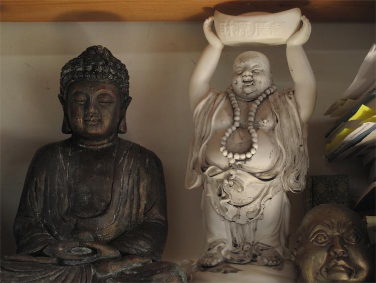 As someone who has followed the Buddhist path– with some detours– for most of my adult life, I want to talk to these people. The Buddha image in particular has huge resonance for me. I have done and continue to do visual art, or what I think of more properly as contemplative practice, that incorporates the image of the Buddha. This practice has led me towards viewing my own art making, regardless of the subject, as an extension of contemplation, primarily motivated by a desire for insight, beauty and emotional ballast, and secondarily as an object in the marketplace. I look forward to visiting the studios and work of artists with a similar perspective, and to seeing the varieties of ways in which their practice takes form.