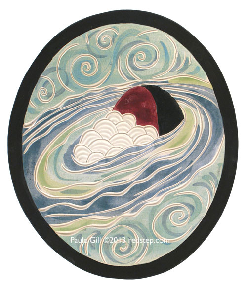 My next foray into the fusion of print making and tile was to create my own underglaze formula that I could apply like printer’s ink onto the surface of tiles with brayers; I can lay down multiple layers of color which creates richly textured surfaces. This led to a whole new body of work that I chose to leave unglazed. This formula has a lovely matte finish that when fired has the appearance of having been painted on with acrylic or oils. The first solo show using this technique was titled “Seeds: Meditations on Hope” in which I explored the metaphor of the Persephone myth.