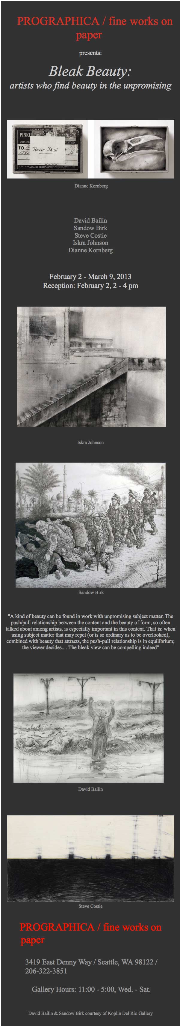 January and February can be harsh times in the turning of the year. The New York Times just had an article titled “January is the Cruelest Month” about our internal clocks and the moon and how we can blame it on the world, the moon and the weather, and it’s all real and not just human weakness. (What a relief. I thought it was just me…..) This exhibit takes bleakness and turns it on its head to show you its stark, resilient and imaginative beauty. As well as a work in charcoal, above, I will be showing five prints in various degrees of contemplative and exuberant color. Hope to see you there!